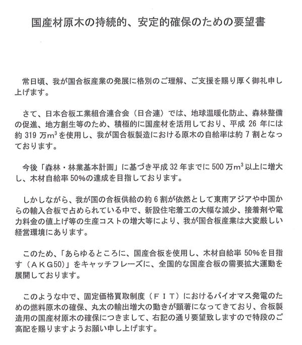 同長官との会見では、バイオマス発電のための原料調達及び急増する原木輸出等により、既に合板用のB材の確保に深刻な影響が出ていることを説明しつつ、マテリアル利用を優先した国産材原木のカスケード利用の徹底のための制度の確立、国産材原木の輸出ではなく付加価値を付けた合板等木材製品の輸出促進、皆伐・新植の促進等について要望しました。