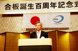 | 記念パーティーに集い、合板誕生100周年を祝う | 主催者挨拶を述べる日合連会長 井上篤博 |
